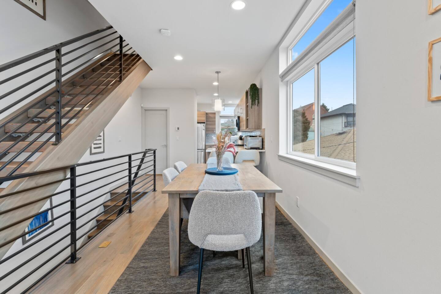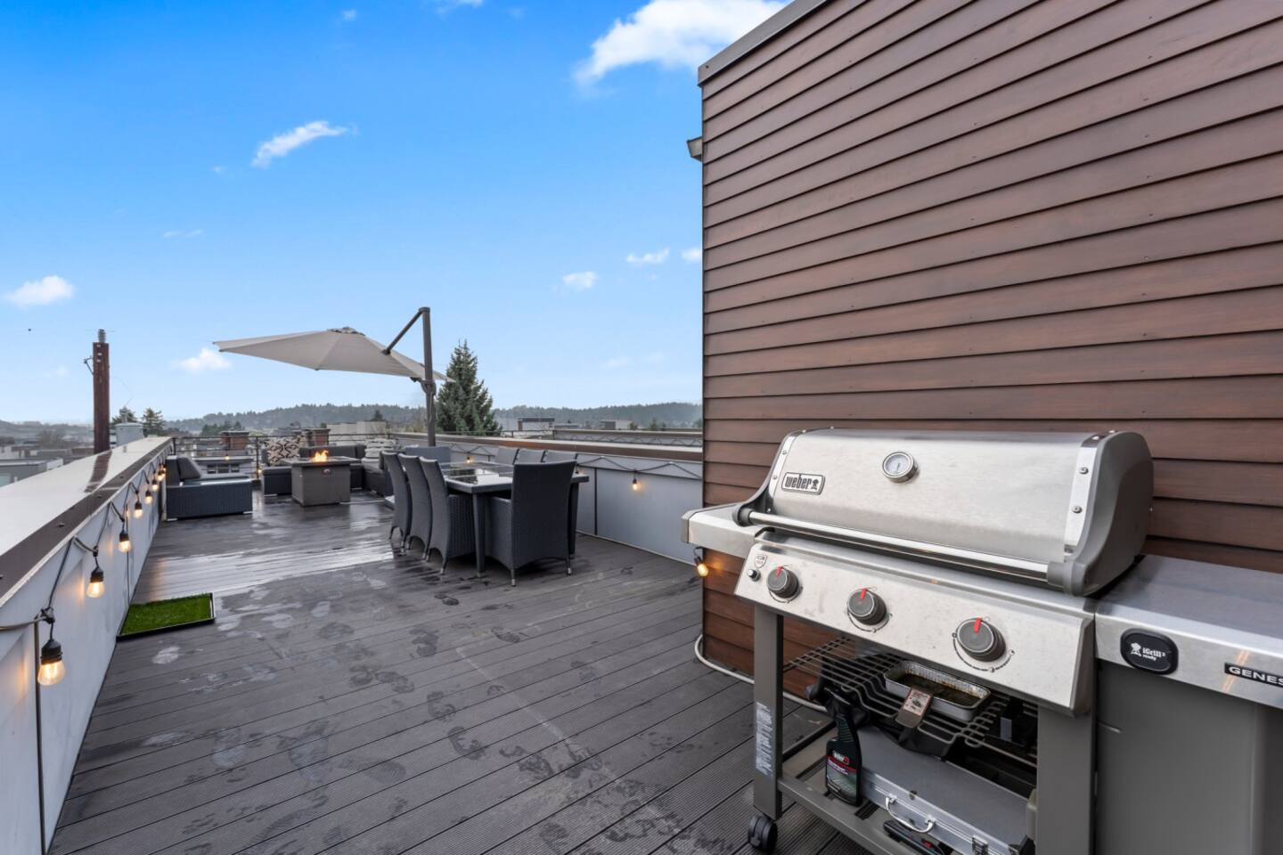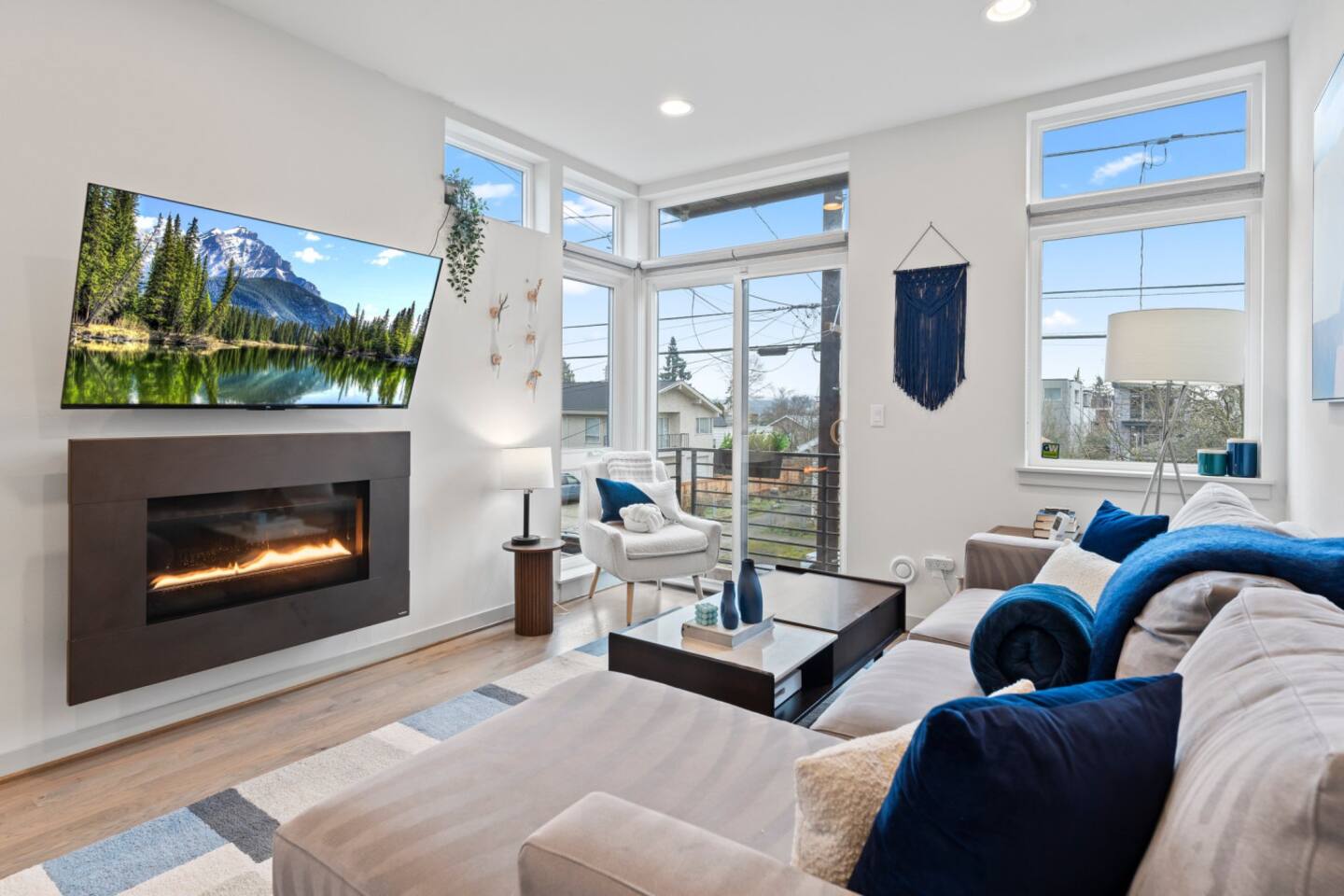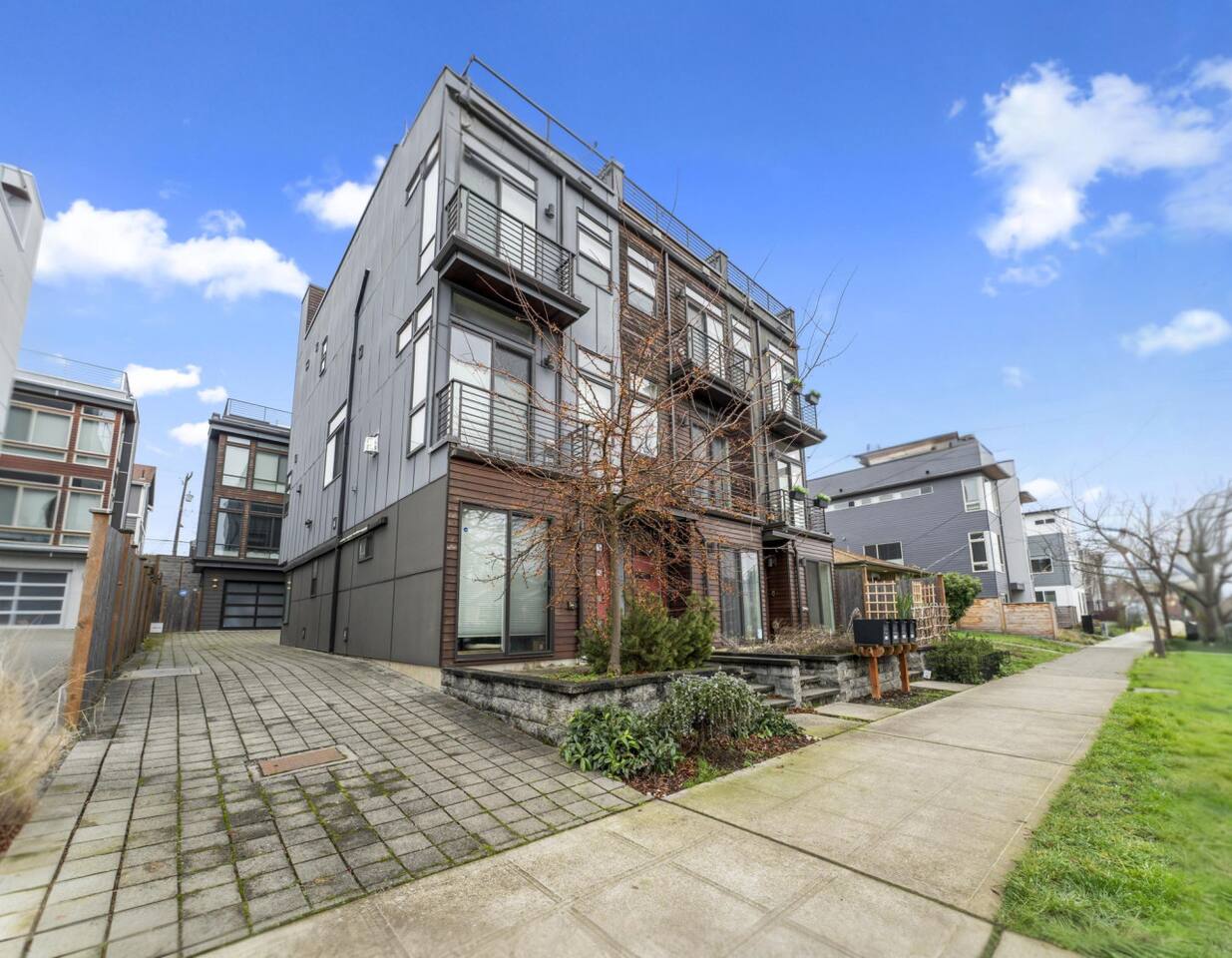 Modern townhome in Ballard with four luxurious levels! The first floor features a twin bunk room, full bathroom, and a bedroom with a blue couch. The second floor offers an open-concept kitchen, living room, and half bath. The third floor includes the master suite with a spa-like bathroom and soaking tub. The crown jewel is the rooftop patio with a gas fire pit and stunning views. Perfectly located near Ballard’s shops, restaurants, and Seattle’s top attractions.