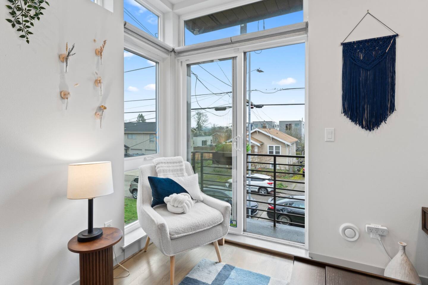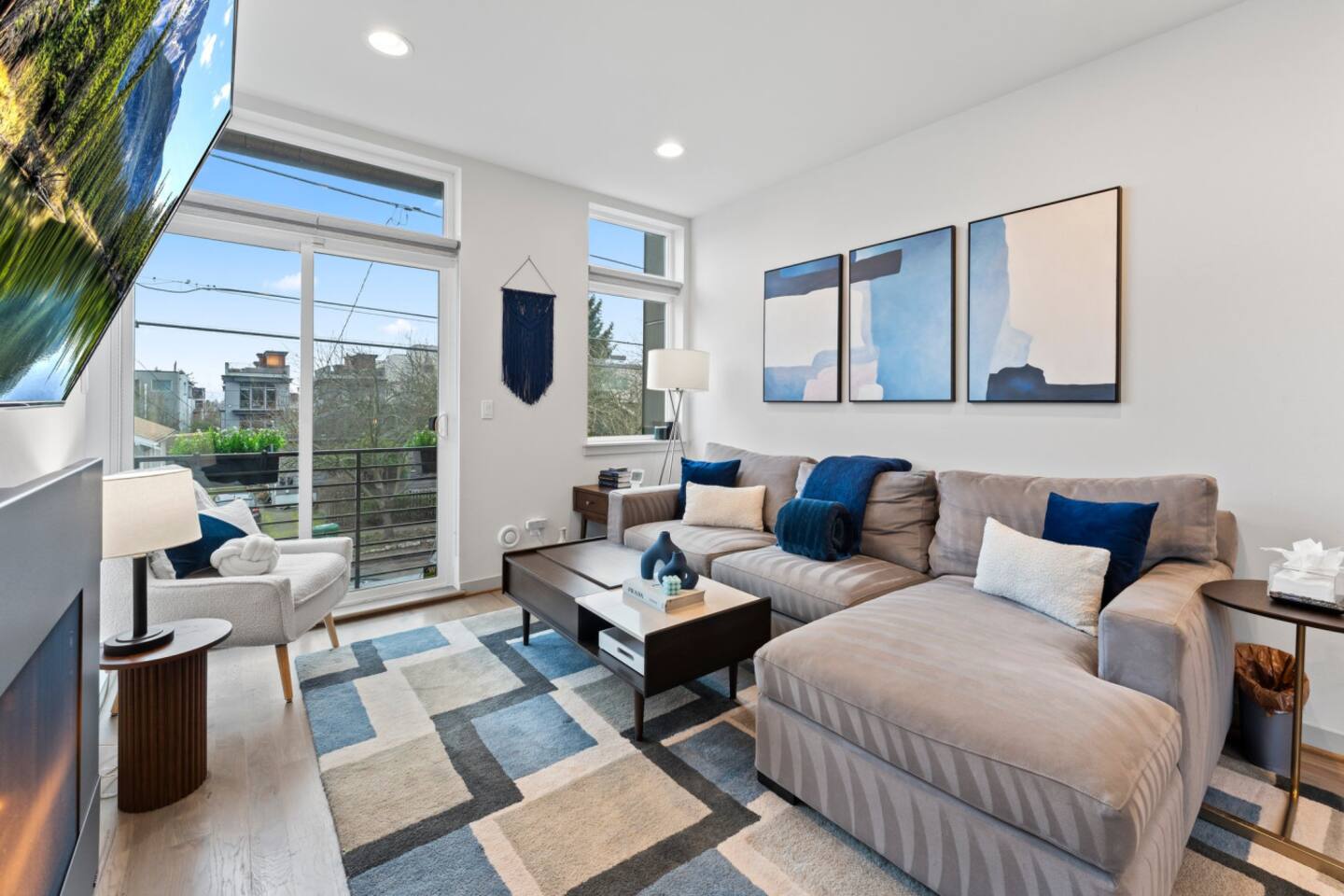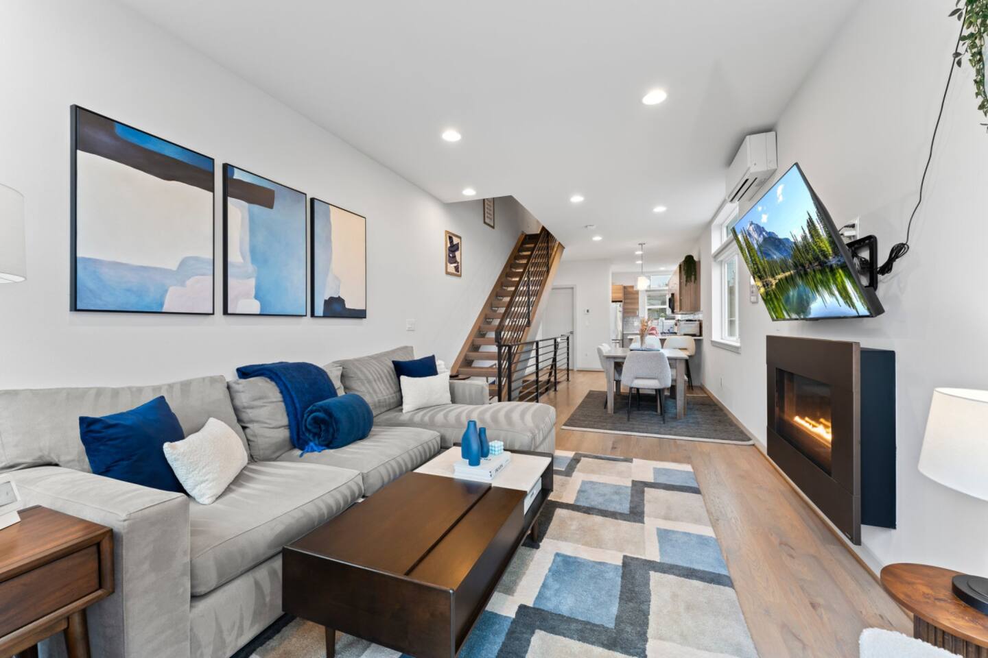 Modern townhome in Ballard with four luxurious levels! The first floor features a twin bunk room, full bathroom, and a bedroom with a blue couch. The second floor offers an open-concept kitchen, living room, and half bath. The third floor includes the master suite with a spa-like bathroom and soaking tub. The crown jewel is the rooftop patio with a gas fire pit and stunning views. Perfectly located near Ballard’s shops, restaurants, and Seattle’s top attractions.