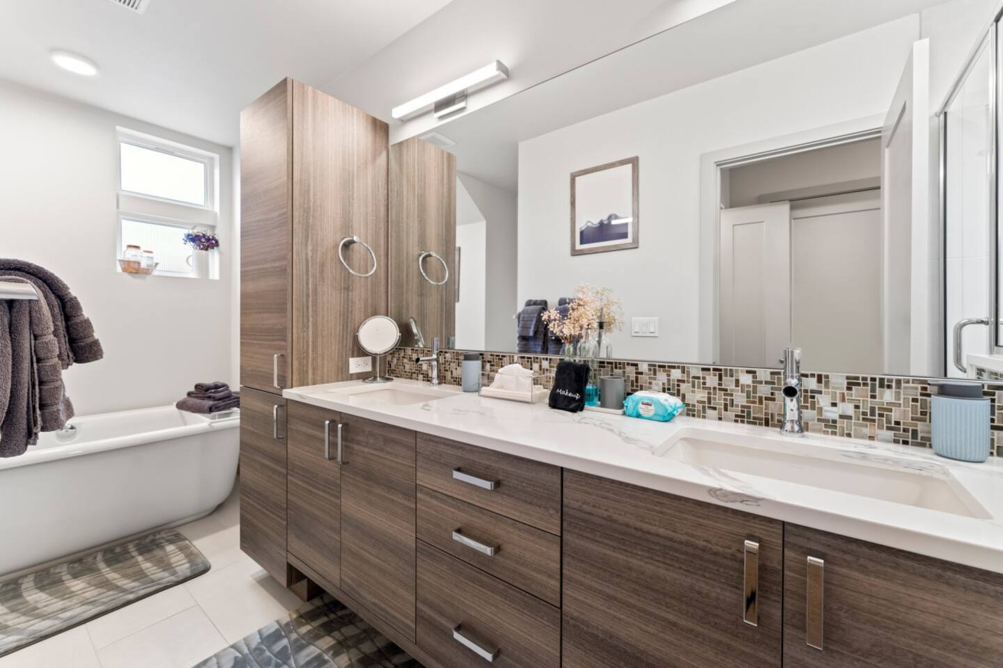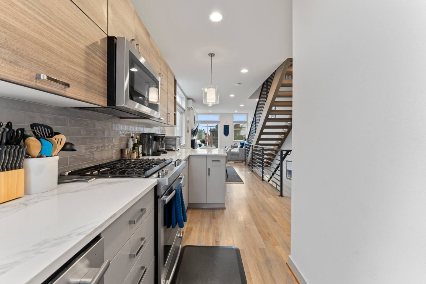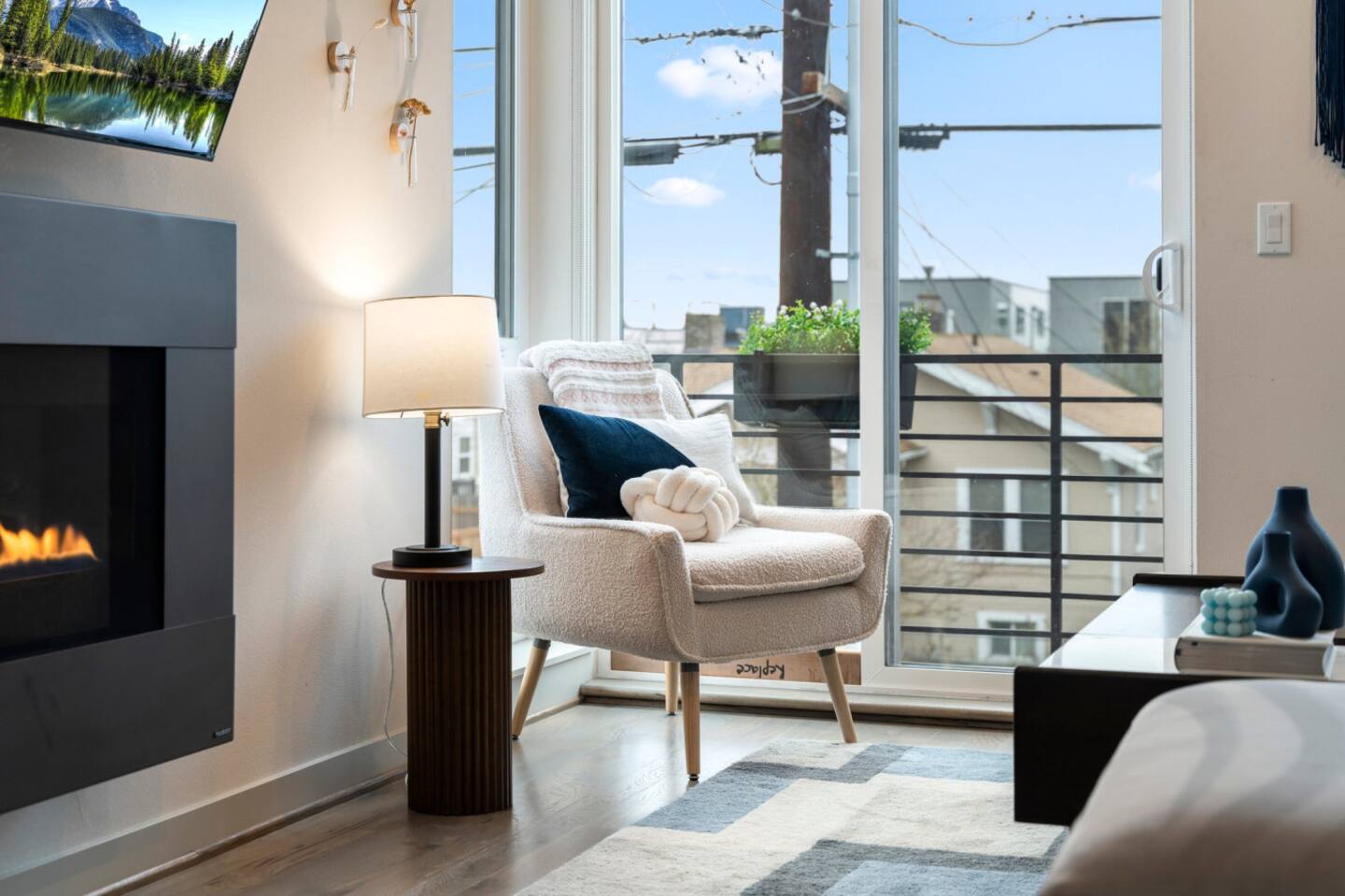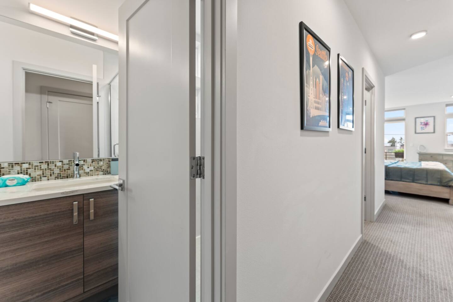 Modern townhome in Ballard with four luxurious levels! The first floor features a twin bunk room, full bathroom, and a bedroom with a blue couch. The second floor offers an open-concept kitchen, living room, and half bath. The third floor includes the master suite with a spa-like bathroom and soaking tub. The crown jewel is the rooftop patio with a gas fire pit and stunning views. Perfectly located near Ballard’s shops, restaurants, and Seattle’s top attractions.