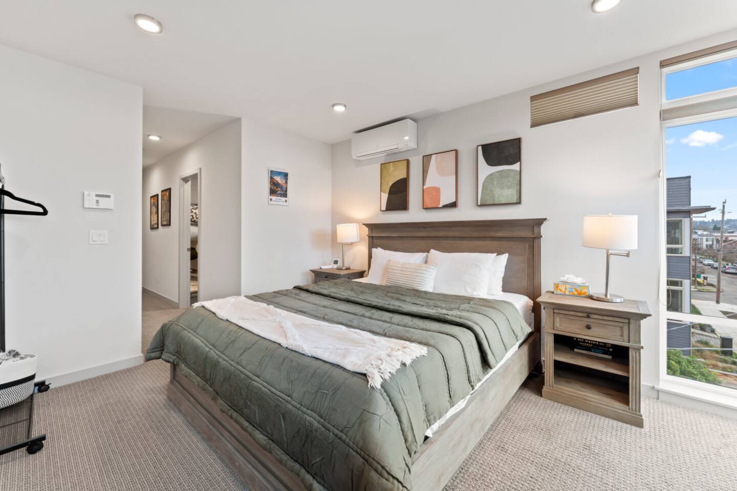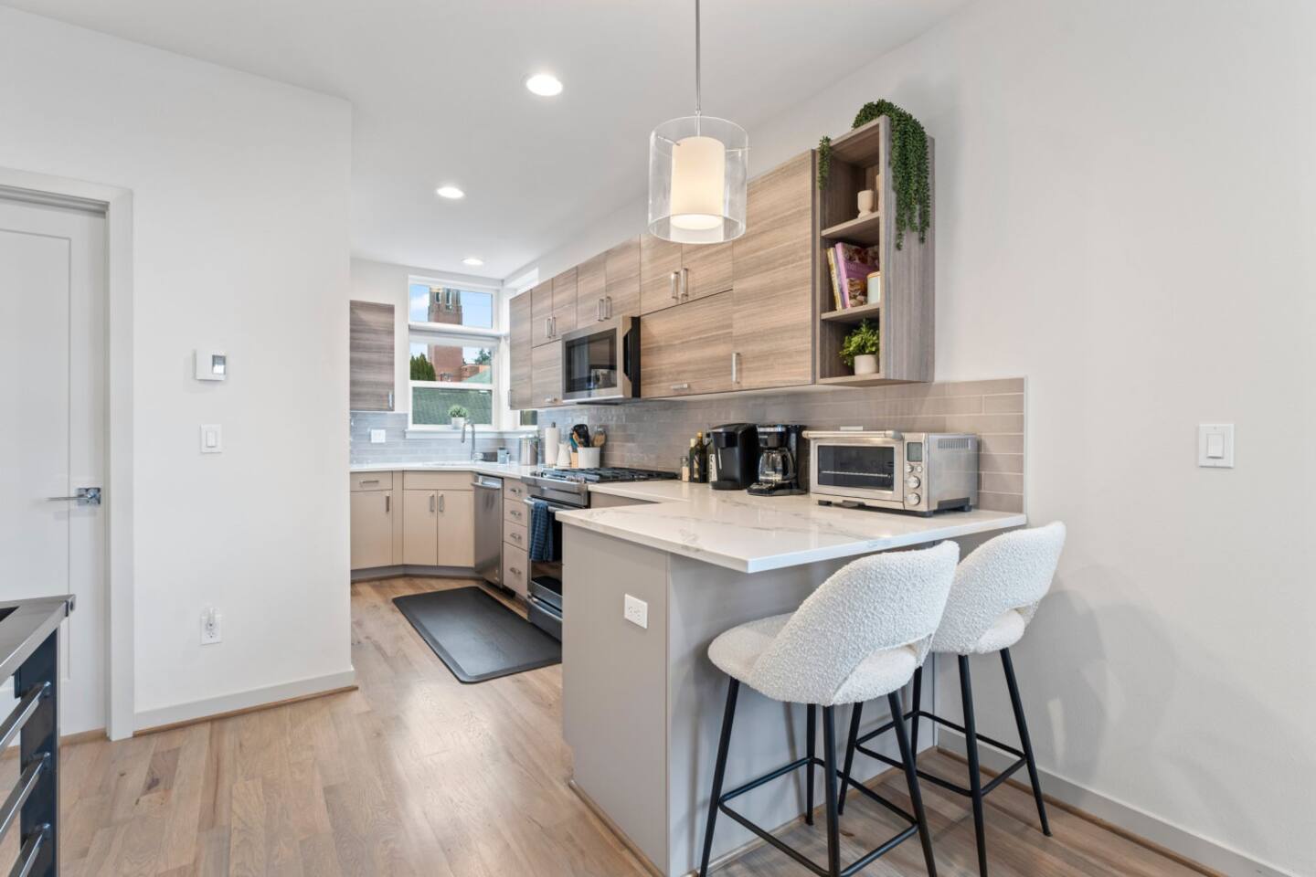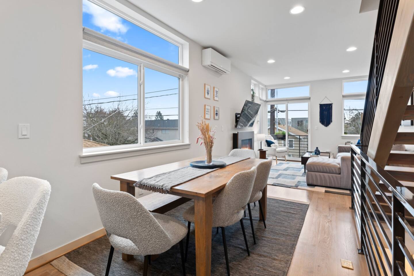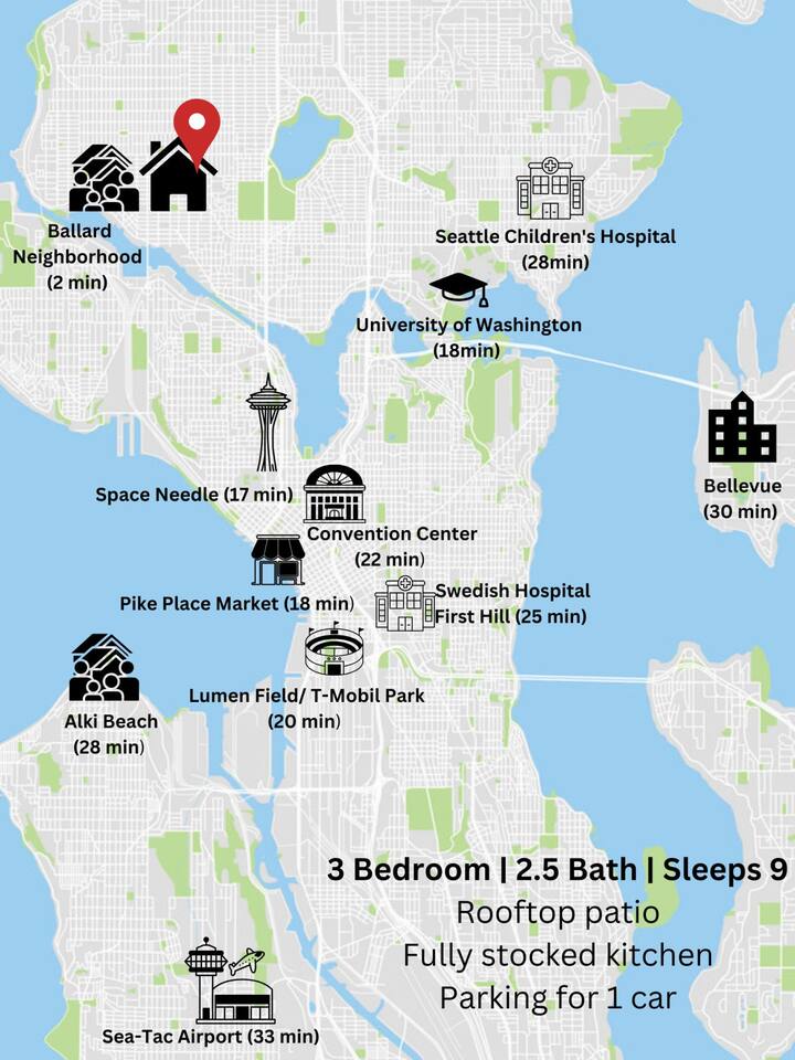 Welcome to your stylish retreat in the heart of Seattle’s vibrant Ballard neighborhood! This thoughtfully designed townhome offers four levels of comfort, convenience, and luxury, perfect for your next getaway. The Space: Step inside and explore the spacious layout: • First Floor: The entry-level features a cozy twin bunk room, ideal for kids or additional guests, alongside a full bathroom for convenience. You’ll also find a versatile bedroom with a blue couch, offering flexibility for lounging or sleeping. • Second Floor: The main living space boasts a bright and open floor plan. A fully equipped kitchen with modern appliances and ample counter space makes cooking a breeze, while the adjoining living room is perfect for relaxing or entertaining. A half bath is also located on this floor. • Third Floor: Retreat to the luxurious master bedroom featuring a plush bed and an en suite master bathroom. Relax in the spa-like soaking tub after a day of exploring the city. • Fourth Floor: Ascend to the crown jewel of the home: the stunning rooftop patio. Equipped with a gas fire pit, this outdoor oasis offers the perfect spot to unwind. Take in breathtaking views of the Seattle skyline and enjoy memorable evenings under the stars. Prime Location: Situated in Ballard, one of Seattle’s most sought-after neighborhoods, this home puts you close to everything. Explore the lively local scene with its eclectic shops, craft breweries, and exceptional dining options. A short drive or bus ride connects you to Seattle’s iconic attractions like Pike Place Market, the Space Needle, and Discovery Park. Amenities: • Rooftop patio with gas fire pit • Fully stocked kitchen and spacious living areas • Master suite with soaking tub • High-speed WiFi and smart TV • Washer and dryer Whether you’re here for a weekend getaway, business, or an extended stay, this home offers the perfect combination of luxury, space, and location. Book your stay today and experience Seattle at its best!