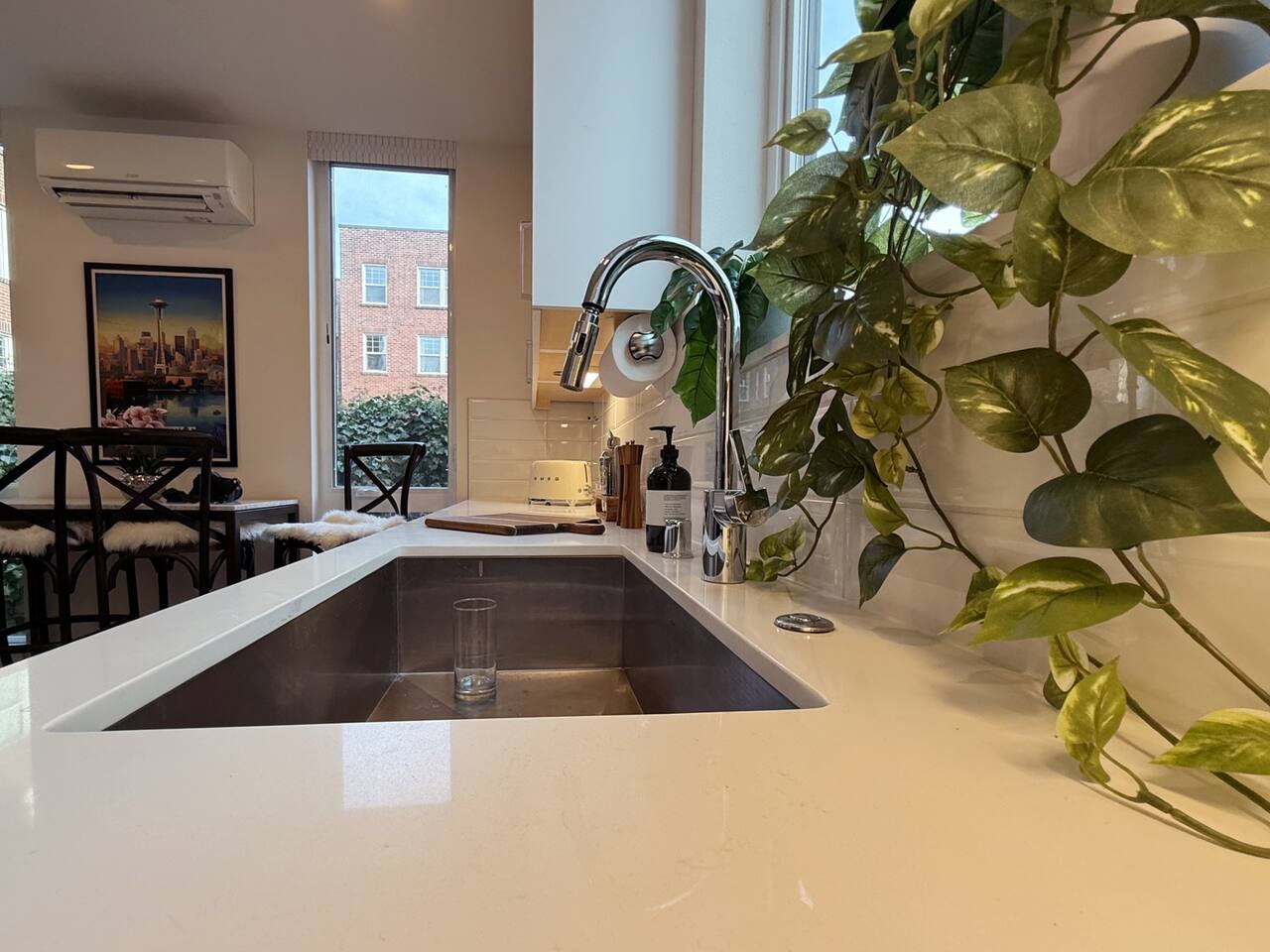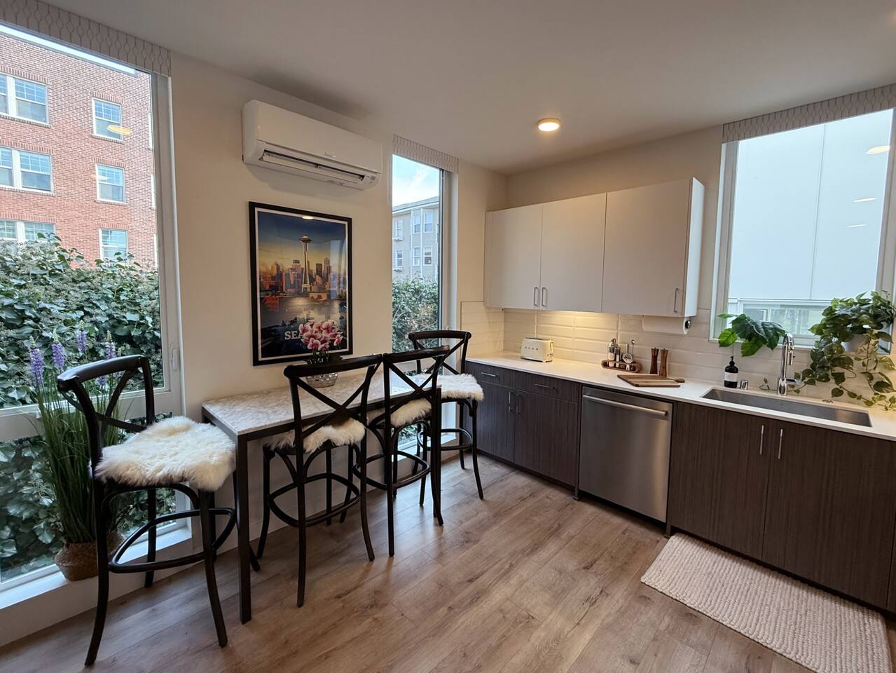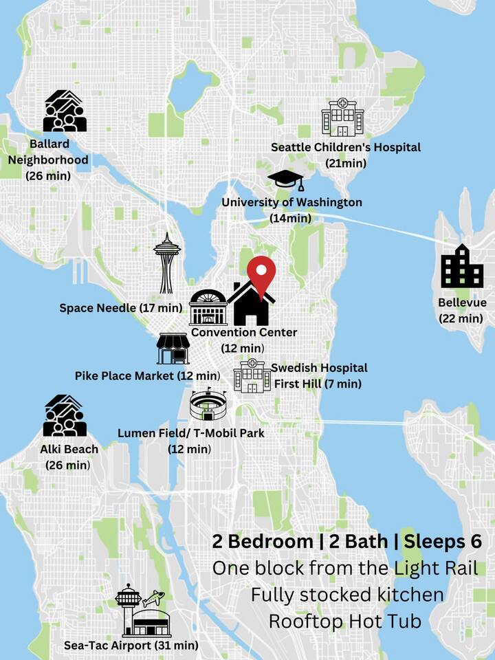 Located a block from the Light Rail, this brand-new Capitol Hill townhouse blends city energy with peaceful retreat vibes. Thoughtfully designed for comfort and style, it features two bedrooms, two baths, and stunning skyline views. After exploring Seattle’s top restaurants and nightlife, unwind in the rooftop hot tub and take in the Space Needle shining over the city lights.
