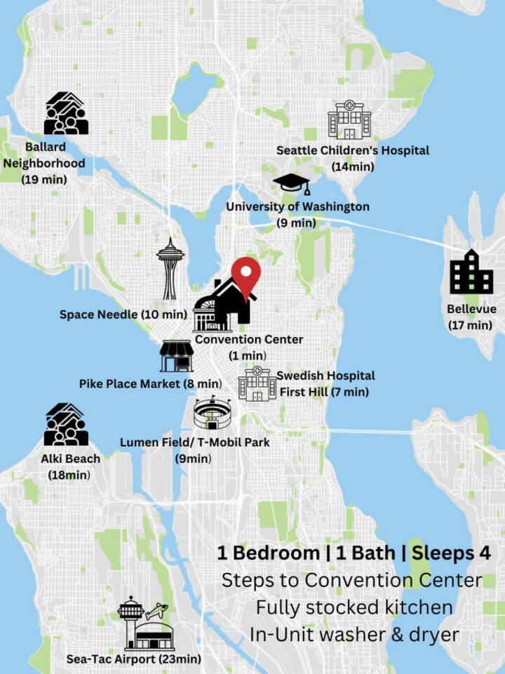 Situated just steps from the Seattle Convention Center, this unit is perfect for both business and leisure travelers. Enjoy a 10-minute walk to iconic attractions like Pike Place Market and the Seattle Art Museum, or a 15-minute stroll to the scenic waterfront. Capitol Hill's vibrant dining and nightlife scene is also within a 10-minute walk, offering endless options for exploration. With excellent public transit nearby, navigating Seattle is effortless.