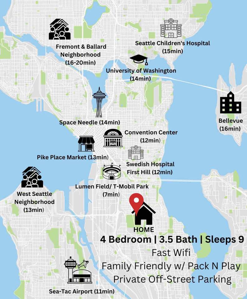 The home is located just about .7 miles from the Georgetown neighborhood. This eccentric neighborhood is full of diamonds in the rough. The eclectic, industrial neighborhood of Georgetown features quirky sites and hidden gems. Conveniently located near restaurants & breweries in Georgetown and is literally right off I-5. Super convenient to access the city but without the hassle of parking. Additionally, it’s about 4.6 miles to Lumen Field and T-Mobil Park. Without traffic the drive to the stadium’s is about 12 minutes.